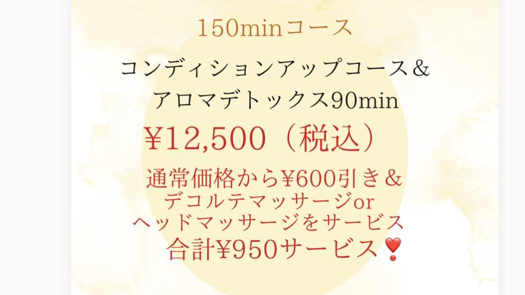 ★夜サロン対象外 ★最終受付13時まで(土曜日は12時まで) ♡デコルテマッサージorヘッドマッサージのサービス付き!! アロマデトックス90分〜コンディションアップコースの 合計150分贅沢コース。足湯あり。 ※10分以上の遅刻は、施術内容を変更していただく場合がございます。 ※妊娠中の方はお受け致しかねます🙏 ※体調不良の方は、回復してからお受けください。 メイク用品はご持参お願いいたします。