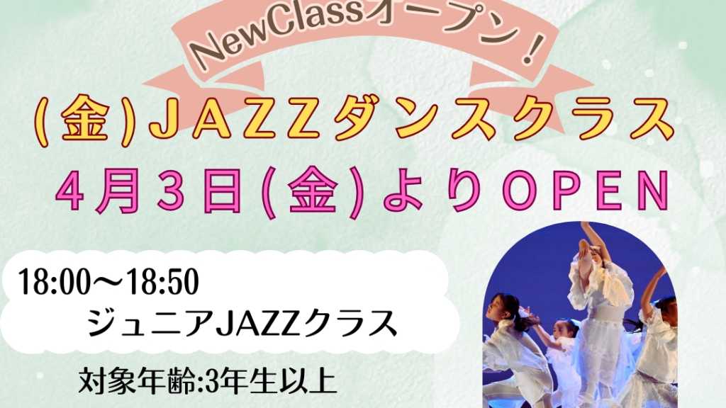 【✨NewクラスOPENのお知らせ✨】 4月3日(金)より \ジュニアJAZZクラスが新たにスタート!/ 🕕 毎週(金) 18:00〜18:50 👧 対象:小学3年生以上 🚉 場所:スタジオブライト Cスタジオ 🚩体験料:1000円 🌼講師:うさぴょん先生 🎉\4月入会キャンペーン/🎉 ✨入会金無料✨ 💡「しっかり上達したい!」という方には → 週2コースもおすすめです✨ はじめての方も大歓迎です😊 お気軽にお問い合わせください✨ ご予約時に、お名前とお子さまのご年齢、ダンス歴の有無をご記入下さい。