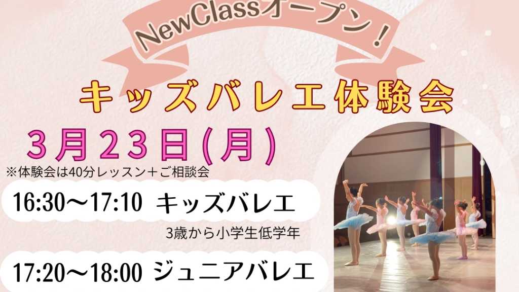 🌸バレエ体験会のご案内🌸【newclass】👏 美しい音楽に合わせて、心も体も軽やかに動かしてみませんか? 初めての方でも安心してご参加いただける、バレエ体験会を開催します。 🩰日程 2026年3月23日(月) キッズバレエ16:30〜17:10 ジュニアバレエ17:20〜18:00 📍場所 スタジオブライトBスタジオ 👗対象 ・3歳さんから小学生低学年 ・小学生3年生以上 💫内容 ・ストレッチと姿勢づくり ・基本のポジションとステップ ・簡単な振付にチャレンジ 🎀持ち物 動きやすい服装、靴下またはバレエシューズ、水分補給用ドリンク 💌参加費 1000円(当日レッスン前にお支払いください) 👸🏻講師 莉子先生 皆さまのご参加を心よりお待ちしております。 必ずご連絡のつくメールアドレスをご登録下さい。 予約確定メールをお送りします。