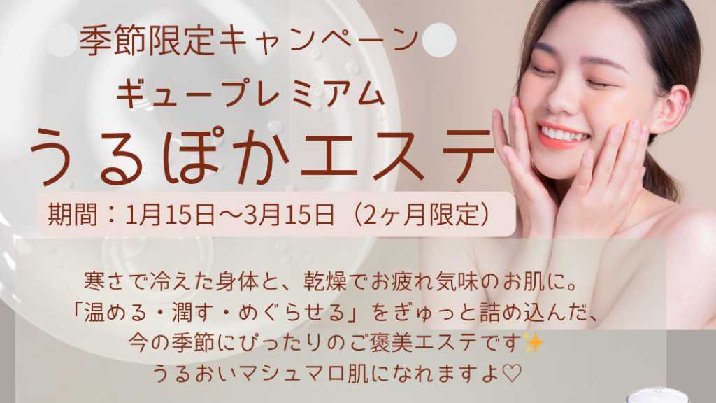 ■サービスの内容 期間:1月15日〜3月15日(2ヶ月限定) 寒さで冷えた身体と、乾燥でお疲れ気味のお肌に。 「温める・潤す・巡らせる」をぎゅっと詰め込んだ、 今の季節にぴったりのご褒美エステです✨ ❤︎足湯 ❤︎顔〜首までクレンジング&洗顔 ❤︎ギュープレミアムマスク(4,000円相当) ❤︎ハンドマッサージ ❤︎フェイシャルマッサージ ❤︎ギュースキンケアで整肌お仕上げ ■当日の流れ 🫖 ギューバスソルトの足湯 + ウェルカムドリンク まずは足元からじんわり温めて、ほっとひと息。 🫧 首まで丁寧クレンジング&洗顔 毛穴汚れやゴワつきをやさしくオフ。 リンパの流れを整えつつ 思わず触りたくなるツルツル肌へ✨ 😴 ギュープレミアムマスク(4,000円相当) 潤いをたっぷりチャージしながら急速回復。 マスク中は、 血行を促すギュープレミアムオイルでハンドマッサージ🤲 💆♀️ フェイシャルマッサージ お顔も贅沢にギュープレミアムオイルを使用。 めぐりを高め、表情までやわらかく。 ※滑らかにマッサージをするために、セサミオイルをブレンドします。 ✨ お仕上げ マシュマロ肌へ導く ・ギューコンプレッションリキッド(ローション) ・ハリアップのプレミアムクリーム で、潤いとハリをしっかり閉じ込めます。 ■ご来店について ・体調不良、感染症、けが、強い頭痛や発熱の場合は施術できません。 日程の変更を承ります。状況によりますので、事前のご連絡をお願いします。 ・ご予約の5分前から、駐車場のご利用とご入店可能となります。 ・同伴の方はサロンで待機して頂けません。 ・ご来店時は香水はお控えください ■キャンセルに関して ・当日キャンセル、無断キャンセルは料金の100%をお振込いただきます。 ・10分以上の連絡のない遅刻はキャンセル扱い、 又は施術内容を短縮させていただきます。
