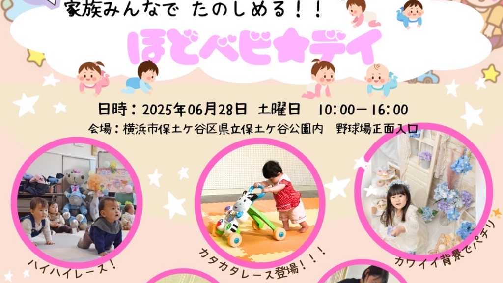 【ハイハイレース9ヶ月まで】 ほどベビ☆デイでは みんなでハイハイレースで盛り上がり、成長記録としても残せる「手形アート」 「フォトスポットでの写真撮影」、 さらには、参加者同士の交流も楽しみましょう。 【 日時 】2025年6月28日 土曜日10:00〜16:00 【 会場 】保土ヶ谷公園 野球場正面ロビー(室内) 【 参加費 】2,000円 1.ハイハイレース 2.フォトブース撮影 3.手形足形デコレーション参加 4.ベビヨガ体験(別途予約が必要になります) https://tol-app.jp/s/minmaru21/215j8v 5.癒しのハンドマッサージ 6.モノづくり体験 ※お持ち帰りお土産 体験チケットを利用し、2〜6の中よりお好きな体験ができます。 ブーススタッフにチケットをお渡しください。 ベビちゃんのレーススケジュールを確認の上、レース参加の時間の場合は、予約を取ってください。 チケット無しでも一般価格で体験も可能です。 時間内にてお楽しみください。 ハイハイ[月齢9ヶ月までの部]各レース5名 🈳がある時間のみ表示されます。 *お申込みの際、備考欄にイベント参加時の月齢の記載をお願いいたします。 レース当日の流れ https://drive.google.com/file/d/10OxANFkhlYjEUD0c-bEAHkvwXfS6ohOj/view?usp=drivesdk 【来場時間の目安】 レースご予約時間の15分くらい前に、会場にお越しください。 ※ハイハイレース開始5分前より、参加者様の点呼、レースのご説明が始まります。 【 持ち物 】 お子さまの必要品、飲みもの、おやつ、オムツなど。ハイハイレースで、必要なお菓子やおもちゃ。体験ブースではパパやママが体験、製作するものもございます。手が空くように抱っこ紐やおんぶ紐をご持参ください。 イベントスペース内は、同年代のベビちゃんのパパママがいらっしゃいます。 つながりを作りながらおしゃべりタイムを楽しんでください! ※駐車サービスは行っておりません、ご了承ください。 ※キャンセルや緊急の連絡は、 min.maru21@gmail.com または090-7613-4090(玉野)まで お願いいたします。