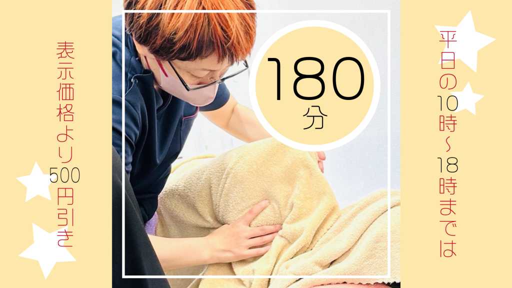 【重要】予約完了直後&予約日前日にメールが届きます。届いてない場合、予約できてませんのでご注意ください。ご不安でしたら下記問合せ先にご連絡ください。 ★おねがい★ご予約時間前にご来店される際は5分前ですとありがたいです♪ ※平日10〜18時の間は表示価格より500円引きです♡ ※他にもお得な割引↓ページ下部に記載↓ 180分プレミアムリトリートコースは、最上級のリラクゼーションを提供するために考案された究極のコースです。全身を余すところなくほぐし、横向きや仰向けでの施術、ストレッチも取り入れた包括的なケアが特徴です。長時間の施術で、深層のコリや疲れを徹底的に解消し、心身のバランスを整えます。贅沢な時間を過ごし、最高のリフレッシュをお求めの方におすすめです。 《リトリート》とは、日常の忙しさやストレスから離れ、心身をリフレッシュするための特別な時間と空間を指します。 【お問合せ・キャンセルのご連絡】 mail: yuuhama_3@yahoo.co.jp Instagram: @hamayuu331 / LINE: @933bmvea 【料金について】 表記価格は税込み価格です。 割引や割増がある場合は精算時に行わせていただきます。 ★60分コース以上から割引有★ ・学割(18歳以下/¥1000引) ・シニア割(65歳以上/¥1000引) ※割引ご利用時はショップカードのポイント付与対象外。 ※ショップカードポイントは60分毎に1pt付与。 ※割引ご利用時はお申し出ください。 後日発覚での割引やご返金はいたしかねますので予めご了承ください。 ★ショップカード★ 3pt進呈!5pt達成で500円割引特典贈呈‼︎