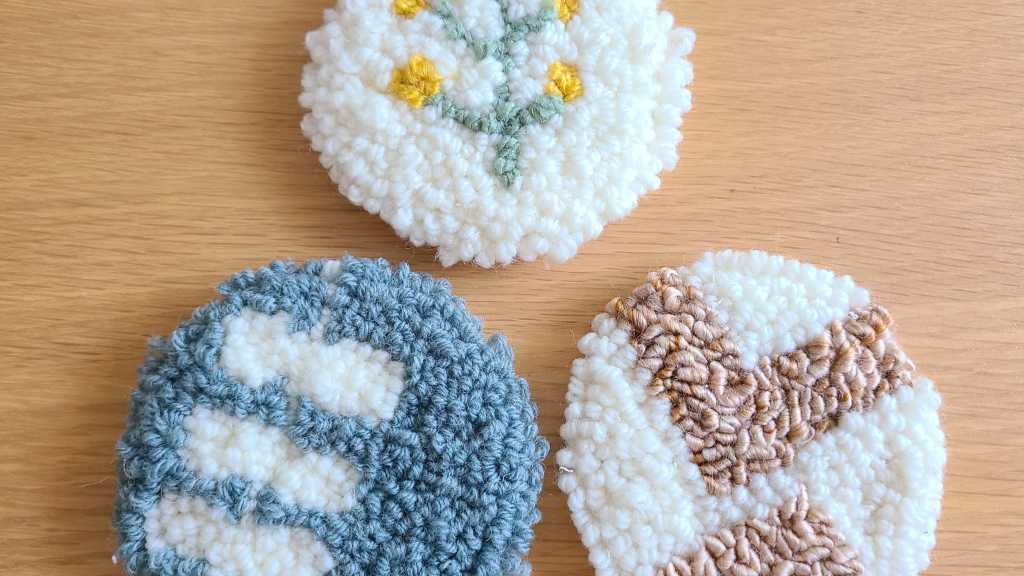 パンチニードルという簡単な刺繍で可愛いコースターを作ります♪刺繍針などセット付きでご自宅でも作ることができます。 持ち物 毛糸(極太か並太)2~3色、はさみ