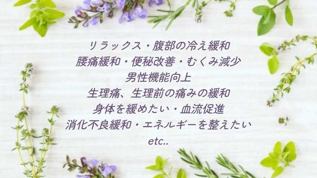 ⚫︎お腹セラピーコース 施術内容 全身を軽くもみほぐし+ストレッチ(タイ古式ベーシック)(60分コースは部分的になります)、お腹の温め・腹部施術 ハーブボール使用🌿 ※120分コース以上から「もみほぐし+ストレッチ」を「オイルトリートメント」に変更可能(+¥1,000) 「自分のお腹は冷えてる?硬い?血流は良い?」 普段なかなか意識を向けることってないかも… そんな「お腹」にしっかりアプローチしていきます ▼以下が気になっている方にオススメです 疲れ・腹部の冷え緩和・腰痛緩和・便秘改善・むくみ減少・男性機能向上・生理痛、生理前の痛みの緩和・ 身体を緩めたい・血流改善・消化不良改善・エネルギーを整えたい・安眠効果 等 〜注意事項〜 ※施術前1時間半はお食事をお控えください。 ※施術前の飲酒はお控えください。 ※がんを患っている方、大きな怪我・骨折をされている方(特に胴体)、38℃以上の熱がある方、腹部手術後1年以内の方、ペースメーカー使用中の方への施術はできません。 ※心臓疾患・高血圧・糖尿病の方、その他 疾患がある方は事前にご相談ください。 ☆オプションメニュー 足ツボ・プラス20分…¥1,000 足ツボ・プラス30分…¥2,000 〜全体の流れ〜 ご来店→お茶☕︎・カウンセリング→お着替え→施術→お着替え→お茶→お帰り
