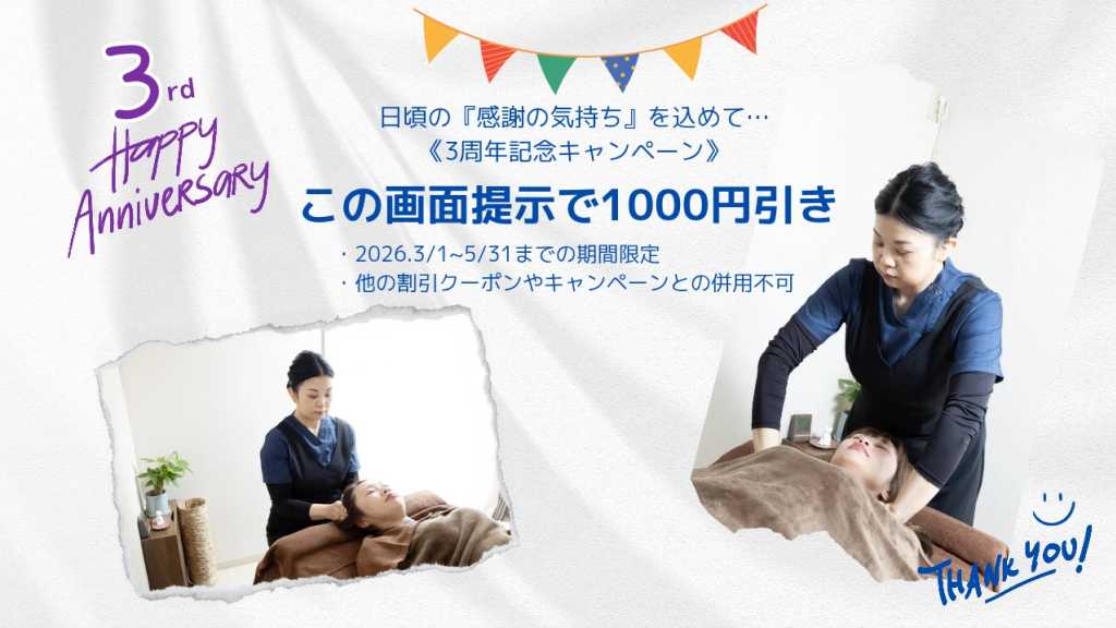 《3周年記念キャンペーン》 おかげさまで ねこのしっぽ~湘南・癒やしのリラクゼーション~は 2026年3月1日で3周年を迎えました 日頃のご愛顧に心より感謝申し上げます 感謝の気持ちを込めまして 期間限定キャンペーンをご用意いたしました ✩この画面ご提示で【1,000円OFF】 ・2026年3月1日〜5月31日まで ・他の割引・キャンペーンとの併用不可 ♧皆様のご来店を心よりお待ちしております♧