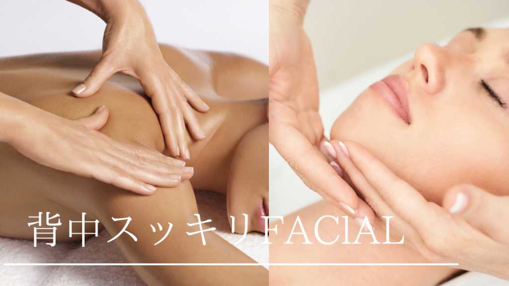 当店の背中スッキリフェイシャルコースは、日々のストレスや疲れで凝り固まった背中の筋肉をほぐし、リフレッシュさせるコースです。丁寧なマッサージと保湿ケアで、お肌もしっとりと潤い、リラックスした気分でお帰りいただけます。