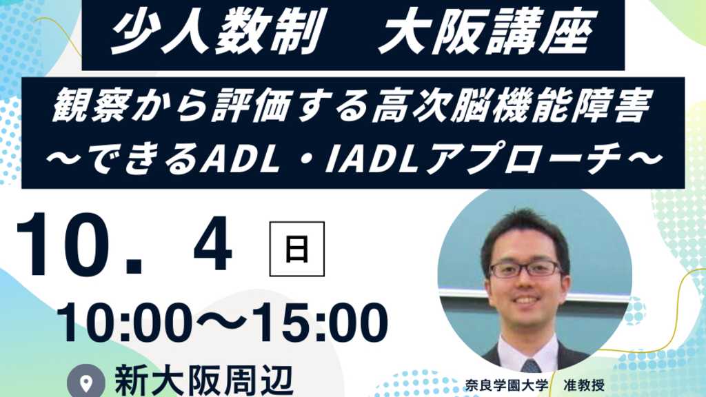 〜できるADL・IADLアプローチ〜 生活場面から読み解く高次脳機能障害 高次脳機能障害の評価といえば、 WCST、かなひろいテスト、SLTA、WAB失語症検査、トークンテストなど、数多くの神経心理学的検査が思い浮かびます。 しかし、「評価できても生活にどう影響するのか分からない」 「訓練室ではできるのに、生活ではできない」 このギャップに悩む臨床家は少なくありません。 本研修では、検査結果にとどまらず、生活場面の観察を軸にADLへ直接介入する思考プロセスを整理します。 高次脳機能障害支援において不可欠な 面接 脳画像情報 主訴 スクリーニング 各種機能評価 ADL観察 これらの情報を統合し、 「何が」「どのように」困難なのかを具体化する方法を共有します。 さらに、観察型評価である A-ONE(ADL-focused Occupation-based Neurobehavioral Evaluation) を手がかりに、 観察情報をどのように解釈し、支援計画へ落とし込むかを事例ベースで解説します。 こんな方におすすめ 観察はしているが、評価・治療へうまく整理できない 検査成績と生活場面のギャップに悩んでいる ADL/IADLを「できる」に導く課題設定と支援手順を体系化したい 講師紹介 東泰弘 先生 (森ノ宮医療大学 保健医療学部) 開催概要 開催日:2026年10月4日(日) 時間:10:00〜15:00(休憩1時間含む) 会場:〒532-0011 大阪府大阪市淀川区西中島 NCL新大阪8号館 9階 (新大阪駅 徒歩7分) 参加費 14,000円 2026年6月末までのお申込み:早割 8,000円