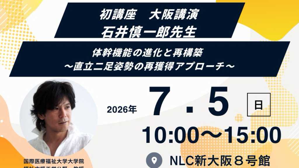 〜直立二足姿勢の再獲得アプローチ〜 ■ 概要 ヒトは進化の過程で、直立二足歩行という特異な移動様式を獲得しました。 腰椎前弯、骨盤形状の変化、体幹と下肢の精密な連動は、直立姿勢の安定に不可欠です。 しかし、加齢・疾患・外傷・長期臥床などにより、この直立機能は容易に失われます。 本講習会では、進化的視点 × バイオメカニクス × 臨床実技の3本柱で、 直立姿勢に不可欠な体幹機能の理解と再獲得に向けたアプローチを体系的に学んでいただきます。 また、実際の症例治療動画の解説も行い、臨床現場で即活用できる実践的知識と技術の習得を目指します。 ■ 講習内容 直立姿勢の再獲得に必要な3つのプロセスを、理論と実技で徹底的に学びます。 1. 直立姿勢の獲得と支持機能の再構築 2. 体幹の直立化トレーニング(腰椎前弯・骨盤前傾・多裂筋・腸腰筋の機能解剖と制御) 3. 体幹と下肢の抗重力伸展活動の協調 開催日時 2026年7月5日 日曜日 開催時間 10時から15時(休憩1時間含む) 開催地 〒532-0011 大阪府大阪市淀川区西中島3-9-13 NLC新大阪8号館 9階 最寄駅 西中島南方駅 (大阪市営地下鉄御堂筋線) 徒歩3分 講師 石井慎一郎先生 国際医療福祉大学大学院 福祉支援工学分野教授 費用 14000円 2026年2月末までお申し込みにて12000円 ペア割 さらに2000円引き 定員 16 対象 pt ot st 柔道整復師など臨床に関わる人全て