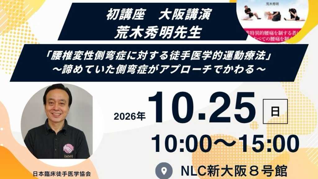 諦めていた側弯症がアプローチでかわる お待たせいたしました 非特異的腰痛の運動療法第2版の著者荒木先生のご講義がオフラインできけます。 腰痛のリハビリの第一人者で必ず腰痛リハビリの評価、訓練技術は向上することをお約束します。 また、今回は臨床で身近な側弯症へのアプローチ 誰もが臨床でみるとはおもいますが、どうしたらわからず、アプローチしない方も多いとは おもいます。 明日から逃げずにしっかりアプローチできるはず。 ご興味のある方はぜひお早めに 腰痛のリハビリに悩んでいるあなた、必ず受講してください。あなたの明日は必ずかわります。 概要 自主トレや生活指導ご紹介 など 荒木 秀明(あらき・ひであき)氏 日本臨床徒手医学協会 代表理事 1984年熊本リハビリテーション学院(当時)卒業後,成尾整形外科病院に入職する。その後,札幌円山整形外科病院,姫野病院などを経て,2013年より現職。脊柱疾患の保存療法をテーマとして,全国で「日本臨床徒手医学協会」講習会開催中。著書に『―非特異的腰痛の運動療法第2版―病態をフローチャートで鑑別できる』(医学書院)ほか。 開催日時 2026年10月25日日曜日 10時から15時 1時間休憩含む 開催地 〒532-0011 大阪市淀川区西中島3丁目9-13 NLC新大阪8号館 新大阪駅徒歩7分 講師 荒木秀明 費用 14000円 2025年2月末まで早割12000円 ペア割さらに1000円引き 定員 20 対象 治療者全て