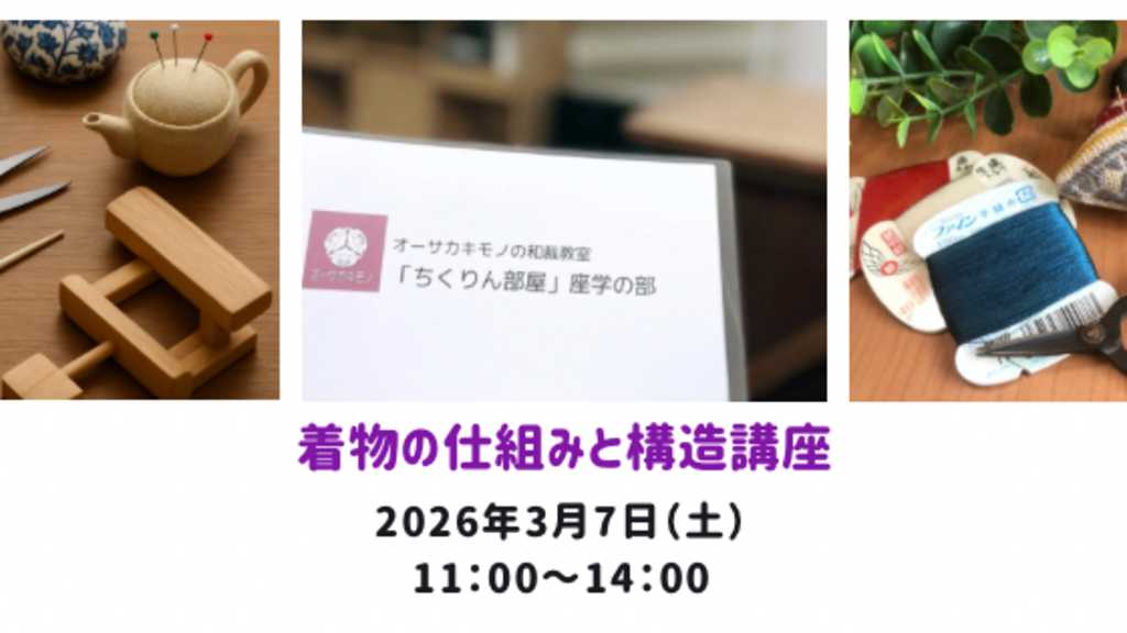 『着物のしくみと構造』講座 概要 ・反物からどうやって着物になるのか? ・背中のあのタックは何? ・マイサイズの導き方 ・着物の裁断から標つけ、仕立ての順序 ・洋服地から仕立てる着物 など 「洋服も作る和裁士」という私の特技を活かし、着付け講師さんとも普通の和裁士さんともちょっと違った角度から、着物をもっと深く知ることができる講義を致します。 私が一方的に話すだけの講義ではなく マイサイズを導き出した後の裁断図を ミニチュア反物を使って作業していただいたり ある着物の画像を見ていただきながら 「この着物はどういう風にできているでしょうか?」ということを 参加者さん同士で考えていただいたりと、 着物初心者さんにも優しい雰囲気の講座を目指しています なるべく専門用語を使わない アットホームな雰囲気の講座を目指してます😊 **************************************** 日程 3月7日(土曜日) 11:00~14:00 ・受講料 7700円 約20ページのテキスト、 裁断解説用10分の1スケール反物(紙製) 付 ・少人数制 1回の講座の最小遂行人数4名、最大12名まで ・お持ちいただくもの 筆記用具、ものさし(20cmくらい)、メジャー(あれば)、計算機(スマホでok) ・場所 タマリバ レンタルスペース 大阪市阿倍野区 https://tamariba-tamariba.com/ 【アクセス】 大阪メトロ 谷町線「阿倍野」駅より徒歩5分 お待たせしました!の土曜日開催 是非ご参加お待ちしております🤗