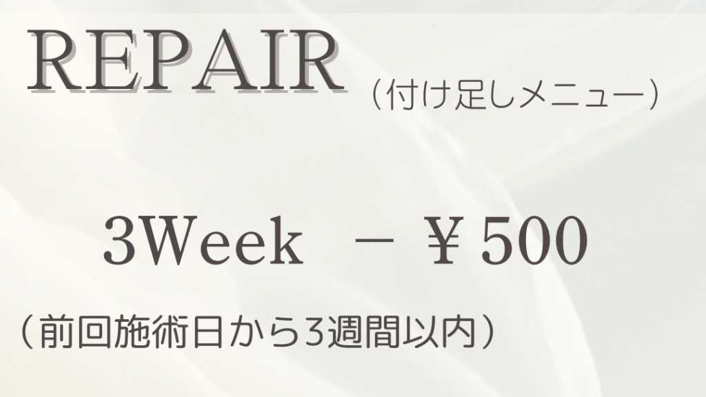 付け足しメニュー☆ 前回施術日から3週間以内(21日)のお付け足しでメニューより−¥500OFF♪ ※他店様のお付け足しは適用されませんのでご注意下さい。