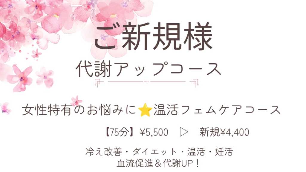 【新規限定】 女性特有のお悩みに⭐️温活フェムケアコース こちらは初めての方限定コースです。 通常¥5,500が、¥4,400 【楽しぼりコース】 サイズダウンはもちろん、むくみ/冷え/美肌/女性特有のお悩み改善にも◎ ルルオンで身体を芯から温め、代謝UP&デトックス ーコース内容(75分)ー *初回はカウンセリングのため、 +30分ほどかかります ①美肌小顔洗顔 ②全身リンパマッサージ ③Luluonn(ルルオン)60分