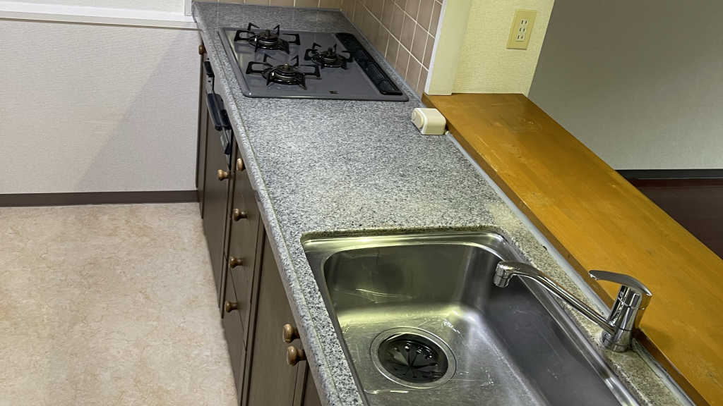コンロ、シンク内、蛇口、調理台、収納扉、照明など