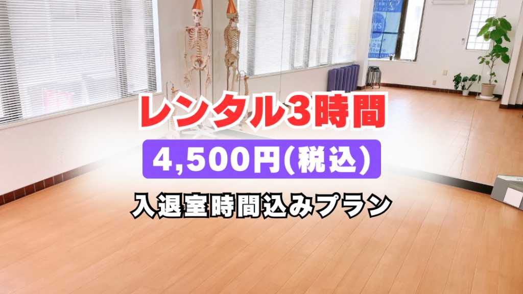 ■予約の際の注意事項 備考欄に、ご利用目的とご利用人数をご記入ください。 ご予約確定後、キーBOXの暗証番号をお知らせします。 ■お支払い方法 直接お支払い(現金、キャッシュレス決済)、銀行振込など ■ご利用の際のお願い 予約時間前の入室はご遠慮ください。 ご利用後はフローリングワイパーでの清掃をお願いします。 エアコンや照明の消し忘れにご注意ください。 必ず予約時間内に退室してください。 スタジオ内では水分補給以外の飲食は禁止です。 ゴミはお持ち帰りください。 ■キャンセルに関して ご予約時間の24時間前から、 キャンセル料50%をいただきます。
