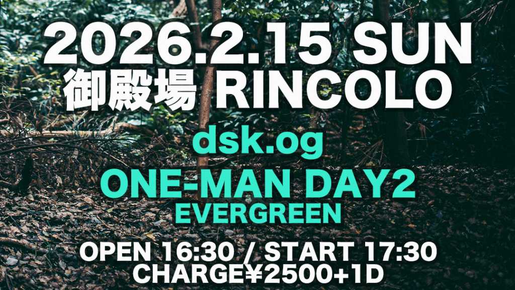 ☆2026年2月15日(日) 《dsk.og ONE-MAN DAY2@御殿場RINCOLO》 〜 EVERGREEN 〜 開場 16:30 開演 17:30 L.C. ¥2500+1drink(¥700) dsk.og 4th アルバム レコ発!! かぶり曲なしワンマン2DAYS!!!