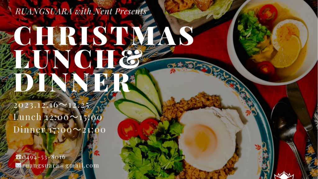 𝐑𝐔𝐀𝐍𝐆𝐒𝐔𝐀𝐑𝐀 クリスマスコラボ企画 with Nent クリスマスランチ🍽️ 12月16日(土)〜25日(月)/ランチ 12:00〜15:00 16日 空席あり 17日 空席あり 18日 空席あり 19日 空席あり 20日 空席あり 21日 休 22日 空席あり 23日 空席あり 24日 空席あり 25日 空席あり ランチプレート¥2,000-(税込) オリジナルナシゴレンorカリアヤム サラダ・デザート付 ※ドリンクは別途 【座席数】店内10席 【完備】Wi-Fi/電源コンセント 【電話番号】0494-53-8016 【住所】埼玉県秩父市上野町8-10 【アクセス】 西武池袋線 西武秩父駅から徒歩7分 秩父鉄道 秩父駅から徒歩5分 【駐車場】3台完備 【注意事項】 ▪️ご予約のキャンセルについて キャンセル2日前キャンセルは承ります。 1日前は50%のキャンセル料 当日は100%のキャンセル料が 発生致しますのでご注意下さい。 ▪️アルコール持ち込みは別途料金がかかります。 ▪️お子様のご利用 お子様のご利用につきましては、誠に恐れ入りますが、 12歳以上のお子様からとさせていただきます。 ▪️ペット ペットはお断りさせて頂いております。 ※その他、レンタルスペースとしても室内ホール、 カフェ、ガーデンをお使い頂けます。 ホールはグランドピアノYAMAHA C3完備。 お気軽にお問い合わせ下さい。 ルアンスアラ 08034091368 https://profu.link/u/ruangsuaravilla827