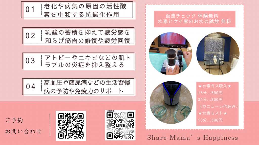錦ケ丘ママのにこにこマルシェ 錦ケ丘ヒルサイドモールにて 血流スコープ体験できます。 今『第3の医療として』注目の『水素』 美容に興味がある方、病気中の方にも、 病気にならない予防医学としての 可能性を秘めています☺️ 血流スコープを用いて健康状態を確認しよう! 採血せずに指先で血液の流れや血管の形をみます。 ゴースト血管はありませんか⁇ 健康の秘訣はズバリ、【良い血流】と 【お水をたくさん飲む】こと。 鼻から吸う水素ガス吸入の15分・30分体験もできます。 病院では水素ガス吸入1時間の相場が11,000円とのこと🫢 血流スコープチェックの方は 予めご予約頂けると助かります🙏 ご自身の水素ガスカニューレお持ちの方は ご持参下さい。 300円のお値引きサービス💴 お手軽水素ミストも、お子様のワークショップ 体験中などの待ち時間にどうぞご利用下さい 当日は14時〜 ヒアリング、お悩みなどのご相談承ります。 事前予約優先として当日空きがありましたら体験可能です。