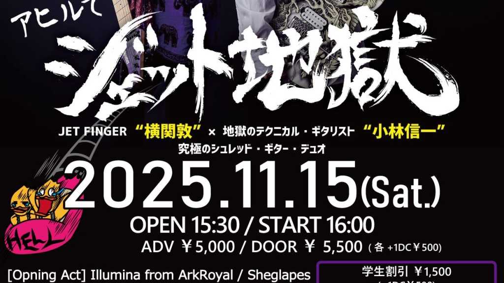 🎫Tiget予約 https://tiget.net/events/413952 ※7/12(土)12:00〜受付開始 ーーーーー 2025.11.15(土) @名古屋 柴田 @-hill 『アヒルでジェット地獄』 OPEN 15:30 / START 16:00 ADV ¥5,000 / DOOR ¥5,500- (各+1DC ¥500-) 学割 ¥1,500-(+1DC ¥500-) ※高校生以下(入場時学生証の提示必須) 【出演】 ジェット地獄(横関敦×小林信一) (O.A.)Illumina from ArkRoyal / Sheglapes 【入場順】 ①予約フォーム(整理番号順) ②バンド予約(整列順) ③当日