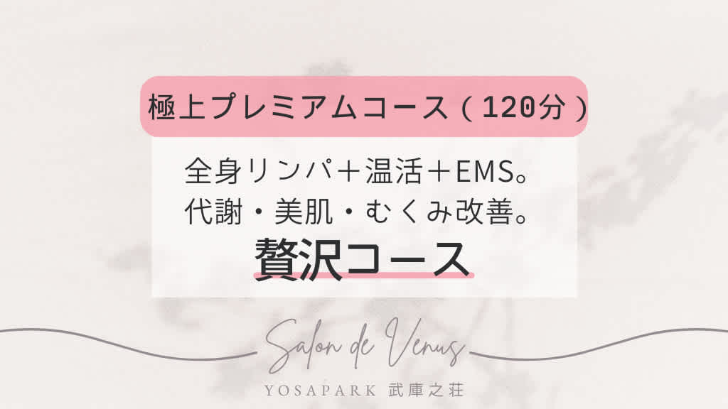 極上プレミアムコース(120分) 【全身リセット&引き締め、贅沢フルコース】 リンパマッサージ、ルルオン温活、足湯、さらに3DEMSパルスを組み合わせた、当サロン最高峰のトータルケア。 深部の巡りを促し、余分な水分や老廃物を流しながら、筋肉を刺激して引き締め効果を高めます。 痩せたい・体を引き締めたい・むくみを徹底的に改善したい方におすすめ。 施術後は軽やかな身体とスッキリしたライン、そして全身がポカポカする充実感を実感できます。