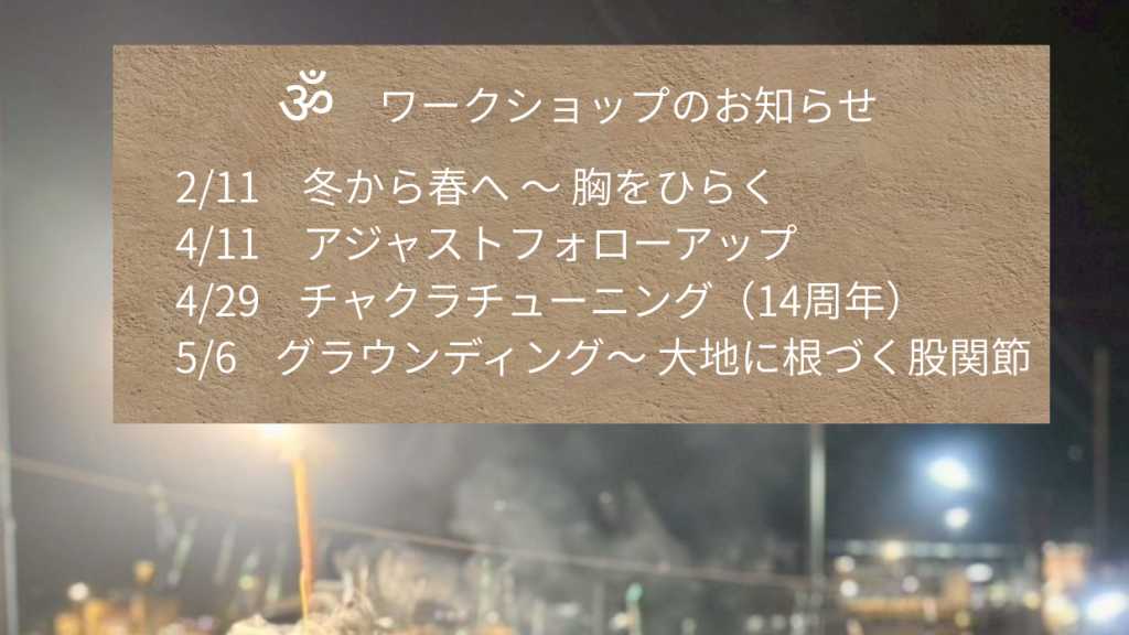 【講座名】 2/11(水・祝) 9:00〜11:00 冬から春へ 〜 胸をひらくヨガ 4/11(土)15:30〜17:30 アジャストフォローアップ 4/29(水・祝)10:00〜12:00 チャクラチューニング(14周年) 5/6(水・祝) 9:00〜11:00 グラウンディング〜 大地に根づく股関節 【定員】 8名(少人数制) 【参加費】 4,000円