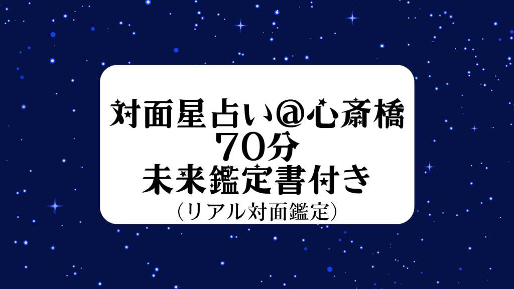 大阪市心斎橋近辺のカフェにて、リアルにお会いして鑑定いたします。 お得な「未来鑑定書付き」です。 心斎橋で占うのは、隔週月曜日と毎週金曜日です。11月は日曜日も行きます。 星占いの中でも、主に生まれ持った運勢である「ネイタル」を中心に読ませていただきます。 ご希望があれば、相性も読みます。 お誕生日から1年の運勢である「ソーラーリターン」、運勢読みの手法である「セカンダリー」「ソーラーアーク」も前もって読んで準備しております。 【備考欄に以下の出生情報をご記入くださいませ。】 ・生年月日※必須 ・生まれた時間(24時間表記で)※正確な時間が必須 ・生まれた場所(都道府県市町村まで)※必須 ・2024年のお誕生日を過ごした場所(都道府県市町村まで) ・2025年のお誕生日を過ごした(過ごす予定の)場所(都道府県市町村まで) 【このようなご相談はお受け出来ません】 ・試験や面接の合否に関すること ・妊娠の可能性に関すること ・紛失物や失踪人の捜索に関すること ・占い師への試し行為 ・金銭に関わること (借金・投資・ギャンブル・株・暗号資産・FX等) ・精神面での通院や専門家への判断が必要な方 ・生死に関わる内容や、病気などの専門家の知見が必要なこと ・その他、当方が難しいと思ったご相談 【キャンセルについて】 事前に下読みをしているため、返金はいたしません。 当日、都合が悪くなった場合、日程調整をいたします。 ・2日前までのお申し出 : 追加料金無料 ・前日〜当日 : 追加料金2,000円 ・無断キャンセル : 日程調整なし ※基本的に女性専用です。ご了承ください。 ※女性と同伴でしたら、男性も鑑定いたします。お2人分読みますので、その場合は2枠を押さえてくださるようお願いいたします。 ※1枠でお1人分の鑑定になります。お友だちといらっしゃる場合は、人数分の枠を押さえてくださいませ。 ※カフェで占うため、ご自身の飲食代の負担をお願いいたします。