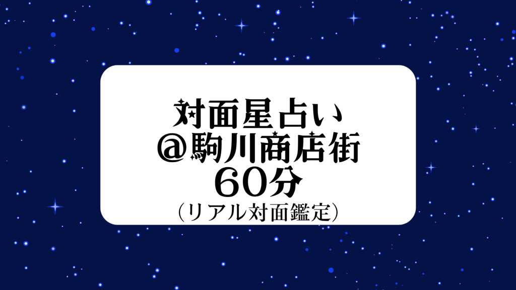 大阪市東住吉区にある駒川商店街のカフェまたはレンタルスペースにて、リアルにお会いして鑑定いたします。 カフェは9:00より、レンタルスペースは12:00より受付可能です。 カフェでの鑑定の場合はご自身のご飲食代を、レンタルスペースでの鑑定の場所は場所代1,000円のご負担をお願いいたします。 星占いの中でも、主に生まれ持った運勢である「ネイタル」を中心に読ませていただきます。 ご希望があれば、相性も読みます。 お誕生日から1年の運勢である「ソーラーリターン」、運勢読みの手法である「セカンダリー」「ソーラーアーク」も前もって読んで準備しております。 未来鑑定書は付いておりません。 ご希望があれば、お申し込みの際にお伝えいただけると、作成いたします。 差額は4,000円です。当日、現金にてお支払いください。 【備考欄に以下の出生情報をご記入くださいませ。】 ・生年月日※必須 ・生まれた時間(24時間表記で)※正確な時間が必須 ・生まれた場所(都道府県市町村まで)※必須 ・2024年のお誕生日を過ごした場所(都道府県市町村まで) ・2025年のお誕生日を過ごした(過ごす予定の)場所(都道府県市町村まで) 【このようなご相談はお受け出来ません】 ・試験や面接の合否に関すること ・妊娠の可能性に関すること ・紛失物や失踪人の捜索に関すること ・占い師への試し行為 ・金銭に関わること (借金・投資・ギャンブル・株・暗号資産・FX等) ・精神面での通院や専門家への判断が必要な方 ・生死に関わる内容や、病気などの専門家の知見が必要なこと ・その他、当方が難しいと思ったご相談 【キャンセルについて】 事前に下読みをしているため、返金はいたしません。 当日、都合が悪くなった場合、日程調整をいたします。 ・2日前までのお申し出 : 追加料金無料 ・前日〜当日 : 追加料金2,000円 ・無断キャンセル : 日程調整なし ※基本的に女性専用です。ご了承ください。 ※女性と同伴でしたら、男性も鑑定いたします。お2人分読みますので、その場合は2枠を押さえてくださるようお願いいたします。 ※1枠でお1人分の鑑定になります。お友だちといらっしゃる場合は、人数分の枠を押さえてくださいませ。