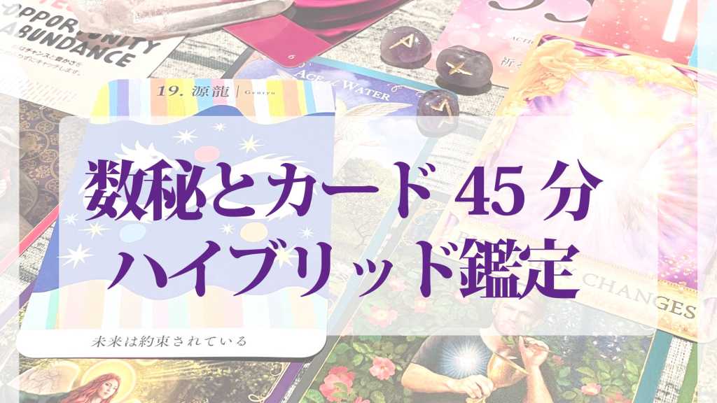 環希がしっかりと 数秘&カードの2つの柱で開運鑑定します。 数秘鑑定は見えるようにタブレットで詳しく 鑑定ポイントを示しながらお伝えします 更に守護メッセージ&ギフトカードも付いた 凝縮された鑑定のお得なプランです 数秘鑑定で本人の生まれ持った「特星」を知ることで 長い人生の傾向や特徴を知り 動きやすくが開運の第一歩 その上で現状気になる事や 総合的な項目をカードを使って鑑定致します。 ご本人の特性をまずは数秘鑑定で知ると 得意な傾向や悩みの傾向がわかり カードリーディングの方向性が はっきりし易くなります。 数秘鑑定+カード鑑定+守護メッセージ+アファメーションカードのギフト付 ※数秘鑑定は生年月日から鑑定致します