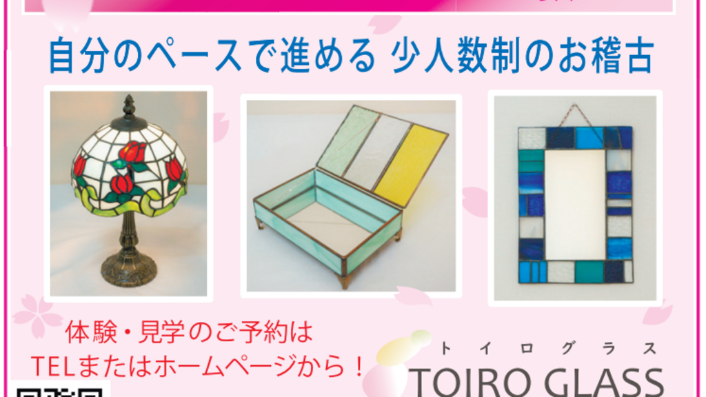 1日2名までの少人数制ステンドグラス教室。 ガラス選びからガラスカット・・・ひと通りの作り方が学べます。何を作りたいですか?それぞれのペースに合わせて進めます。 【授業料】(チケット制) ①2回分5,000円 ②工具レンタル付2回分6,000円 ③4回分10,000円 ④工具レンタル付4回分12,000円 ※入会金・設備費はございません。 ★ご予約はお早めに!電話またはLINEよりご予約ください★