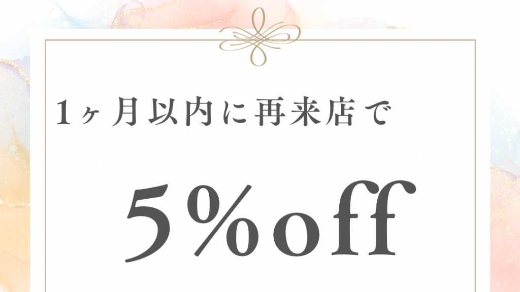 ※自動適用されるので、こちらは選択頂かなくて結構です! ※ここの予約サイトからご予約の方のみ、適用。 ◎今の痛みやしんどさを良くしたい ◎定期的にケアして、不調や不快感を少しでも減らして過ごしたい ◎セルフケアをサボりがちだから代わりにケアして欲しい など… そんなあなたに…♡ 30日以内に再来店でケアされる方は、どのコースでも【合計から5%引き】に✨ ※前回の利用日から30日以上開いた時は、また通常料金に戻ります。 そこからまた30日以内にご利用の際は5%オフが適用。 コンスタントにご利用の方は〈何度でもずっと5%オフ〉♪ ※他クーポンや割引との併用は不可