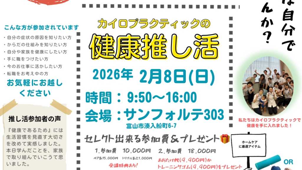 ■サービスの内容 1日でトータルケアのカイロプラクティックの中身をまるっと体験♪ まず身体を変えていくのに必要なのは? 体験の中には骨盤調整のやり方も♪ 自分も!そして周りの方の身体も整えてあげましょう♪ 人生を豊かにするには正しい情報を学ぶ事から😌 毎回わいわい楽しく開催中! 1名参加10,000円 ペア割あり✨️ 運動枕付き18,000円 お得に知識技術知りましょう☘️ ■ご予約について 予約サイトまたは、公式LINEにて直接ご連絡いただいても大丈夫です。 予約サイトからの場合、こちらから後日確認のご連絡させていただきます。ご了承ください。 ■キャンセルに関して キャンセルの場合、前日までにお願いいたします。