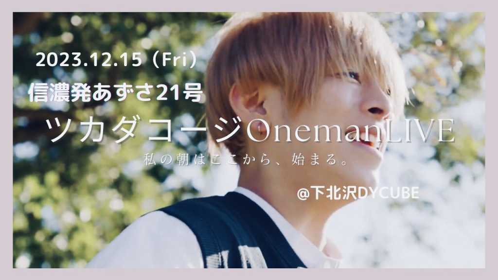 2023年12月15日(金) ツカダコージワンマンライブ 「私の朝はここから、始まる。」 ▪️会場 下北沢DYCUBE 住所 〒155-0031 東京都世田谷区北沢2-26-25 アーロム下北沢B1 TEL:03-5738-8620 FAX:03-5738-8621 最寄り駅:小田急線・京王井の頭線「下北沢」駅より徒歩1分。 小田急線東口改札、京王線井の頭線中央口改札から駅を出て、左に進み、みずほ銀行の左の坂を上ります。 正面つきあたりの無印良品を右に曲がり、隣のビル横の左手に当店入り口がございます。 ▪️時間 OPEN 19:00 START 19:30 サポート Pf Cho 佐藤めぐみ Per Cho 稲葉やすべえ康典 Viola 中島伊代