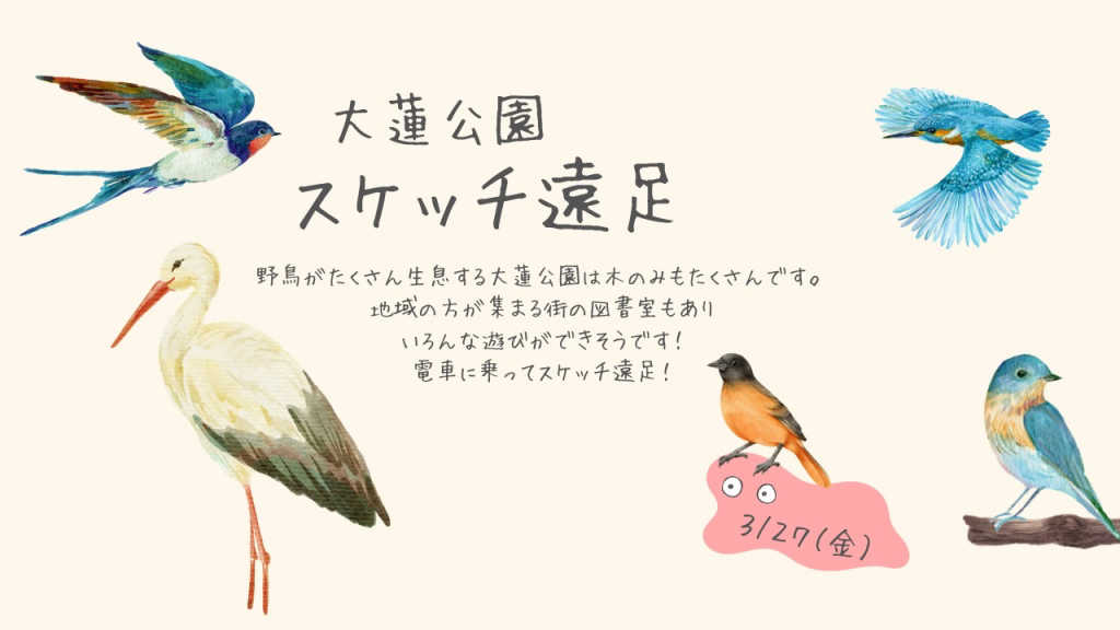 \大蓮公園/ 電車にのって遠足です。 大きな公園の中に、たくさんの種類の野鳥が見れます。 また、図書館や、コミュニティスペースがあります。 木の実や植物もたくさんなので、 外で大きく遊んだあとは、図書館で、絵を描いたり、調べたり。 なぜこのような場所があるのか 【こども会議】をしてみようと思っています。 異年齢で助け合いながらお出かけ。 自分の役割をそれぞれ担当することで 「できた!」 「次は〇〇をやってみたい!」 そんな主体的に動く心を育てます。 【担当講師】 はせなつみ わきこ先生(イラストーター) 【参加費】 3500円 (交通費別途 680円) 【タイムスケジュール】野外活動です。 9:00集合(中央図書館前) ↓ 地下鉄 西長堀(なんばで乗り換え) ↓ 南海電車 泉ヶ丘 ↓ 10:20 大蓮公園 ↓ 遊ぶ(お昼ご飯) ↓ 15:00帰路へ ↓ 16:30ごろ解散予定 【対象】 5歳〜 ※母子分離で行います。おひとりで参加できるお子様は5歳より小さくても受け入れ可能な場合があります。ご相談ください。 ※ご希望の方は保護者の方もご参加可能です。 ※ 先着8名まで お問い合わせは公式LINEからお願いしております。 お気軽にメッセージください。 公式LINE https://lin.ee/I6cw9Bt HP https://unirano.jp こどもよがInstagram https://www.instagram.com/unirano.kodomo.yoga?igsh=MTM3M3RtZXQxY280Zg%3D%3D&utm_source=qr