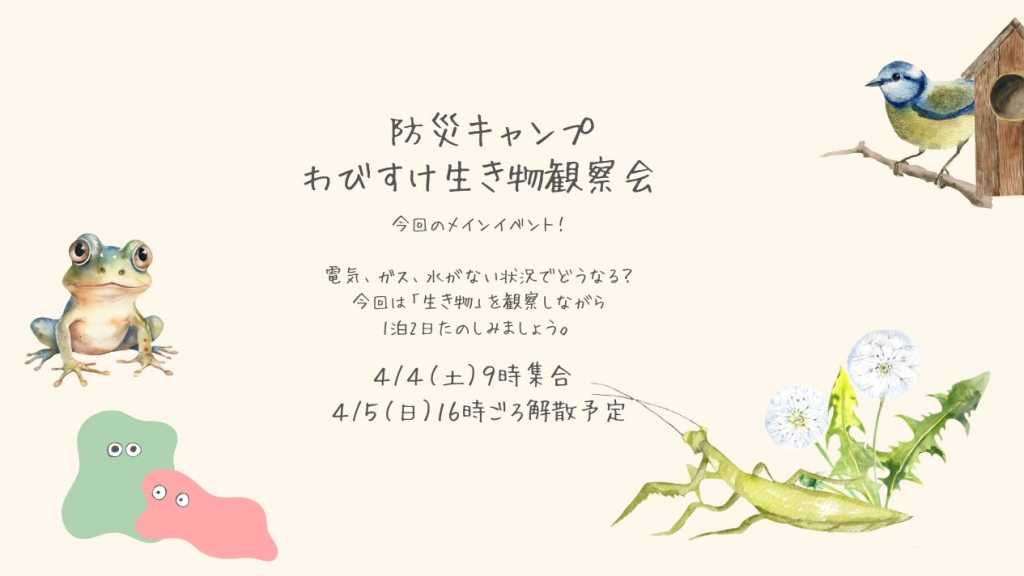 今年のテーマは 「生き物」 河内長野の里山わびすけをお借りします。 わびすけには、絶滅危惧種の生き物がたくさんいます。 専門の先生と一緒に生き物調査。 生き物や自然があるおかげで 水、電気、ガスがなくても豊かな生活が送れる、 生き物と共存しながら、どう暮らすかを体験します。 これまでに深めた仲間との絆。 自分の得意な事で、誰かの役に立つ そんな経験が自己肯定感を伸ばします。 防災の学びにもなりますよー みんなちがってみんないい! を楽しみながら体験してみよう! 【担当講師】 はせなつみ 【参加費】 18000円 ※1泊2日 4食(1日目昼ご飯、夜ご飯、2日目朝ご飯昼ごはん付き) 【タイムスケジュール】 zoomをつかって オリエンテーションを行います。メンバーがきまりましたら日程を調整します。 ※参加できない方は別途対応いたします。 4日(1日目) 9:00集合 ↓ 電車で河内長野へ ↓ お昼ご飯 ↓ あそぶ(生き物観察会) ↓ 夜ご飯 ↓ 就寝 5日(2日目) 起床 朝のだんらん ↓ 朝ごはん ↓ あそぶ(まとめ) ↓ お昼ご飯 ↓ 食べた後13:00ごろ出発 ↓ 15:00ごろ解散 【対象】 5歳〜 ※母子分離で行います。おひとりで参加できるお子様は5歳より小さくても受け入れ可能な場合があります。ご相談ください。 ※宿泊施設で1泊します。 ※ご希望の方は保護者の方もご参加可能です。 ※ 先着6名まで 里谷わびすけ https://www.instagram.com/wabisuke_garden?igsh=ZWVxdjB0dnAzaGNs こどもよがInstagram https://www.instagram.com/unirano.kodomo.yoga?igsh=MTM3M3RtZXQxY280Zg%3D%3D&utm_source=qr