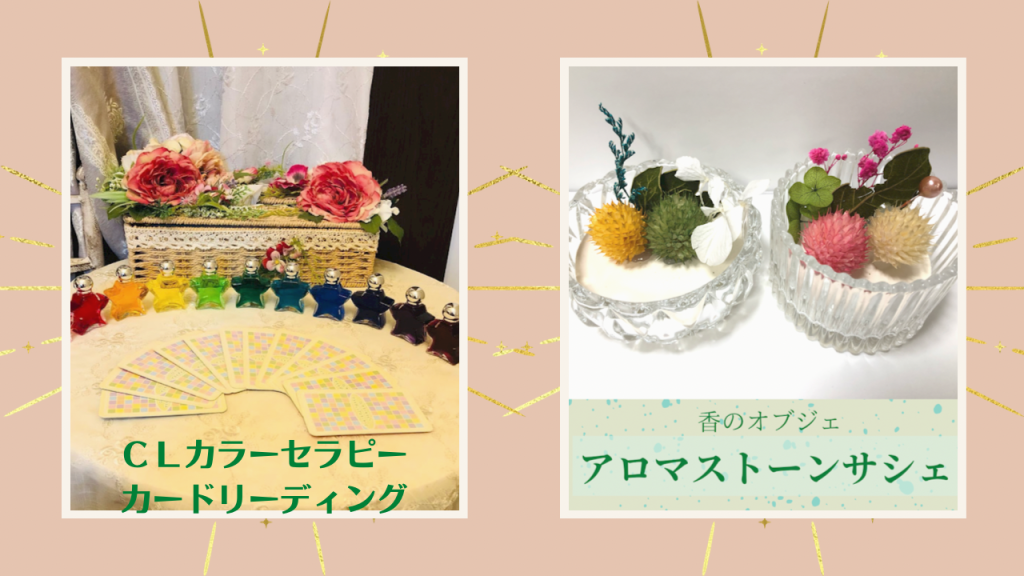 ☆癒しのakua 《CLカラーセラピー》 星座とカラーが融合したカラーセラピー☆彡 可愛い星型ボトルから過去・現在・未来の気持ちと 「なりたい未来に対して、今するといいこと」を 読み解きます💓 ☆料金 2本詠み500円 5本詠み1,000円 両方 1,500円 《カードリーディング》 今気になっている事・知りたい事など、 カードを引いて頂き、引いたカードを 読み解きメッセージをお伝えいたします♡ ☆料金 イベント価格→15分・・・1000円(通常3,000円) ☆VAGUES ✿アロマストーンお絵描きプレート♡アロマストーンサシェ プレートはお好きな絵を描いて香りのプレートを作ります サシェはお花をデコって香りのオブジェを作ります 小さなお子様から参加可能です アロマストーンお絵描きプレート500円 アロマストーンデコプレート1000円 アロマストーンサシェグラス1500円