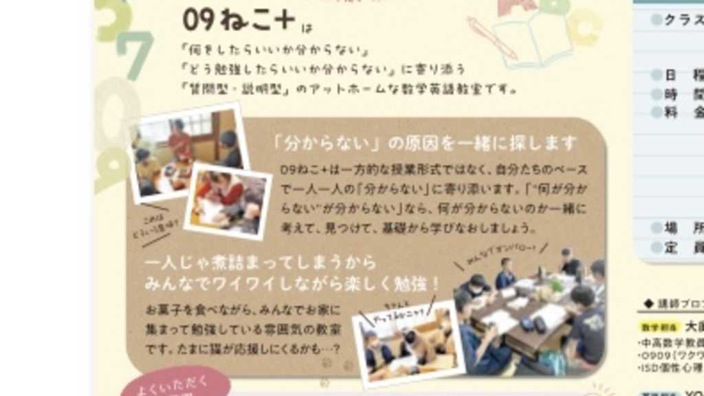 0909「算数数学」と猫がみまもる英語教室「英語」の コラボオプションクラスです。 両教室に通っていなくても受講可能です。 現在は土日のどちらかに月2、3回を目安にやっております。(小学生は不定期) 月により日程が変わりますので、フォームの方からご確認ください。 単発は2000円ですが、お得なチケットもございます。 チケットについてもフォームの方に書いてありますので、ご確認いただけたらと思います。 基本的にはこちらのフォームからのお申し込みとなりますので、下記URLからお申し込みをお願いします。 https://forms.gle/7hw2kHPBrhaZpMWw8 ↑こちらのフォームに申し込んでいただければ、 このサイトからのお申し込みは不要です。