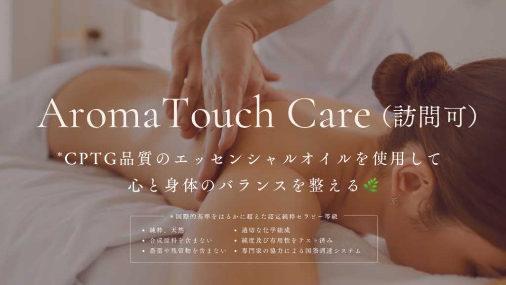 ■サービスの内容 CPTG品質のエッセンシャルオイルを使用して 心と身体のバランスを整える🌿 五感の一つである『触覚』に働きかけるタッチセラピーと、『嗅覚』に働きかけるエッセンシャルオイルの香りの相互効果は、交感神経・副交感神経のバランスを整え、ストレスや痛みの緩和、ストレスによる不眠の改善、抗うつ、ホルモン調整、血行促進、止血、抗菌、鎮静、利尿、免疫向上などの効果が期待できます。 ■当日の流れ 簡単なカウンセリングとパッチテスト後の施術となります。 ■予約の際の注意事項 ・訪問の場合は訪問料として別途¥500頂戴致します。 ・以下に当てはまる方は、原則として施術できません。 ☑︎当日飲酒された方、または二日酔いの方 ☑︎発熱している方 ・上記事項に該当している場合やそれに類似する事由により、施術をお断りする場合があります。体調が悪い時は、施術を受けることをお控えください。 ・予約後、事前打ち合わせのためインスタDMもしくは公式LINEにて「○月○日、予約しました。○○(名前)です。」とご連絡下されば助かります🙏✨ ■キャンセルに関して キャンセルの際はインスタDMもしくは公式LINEにてご連絡下さい。