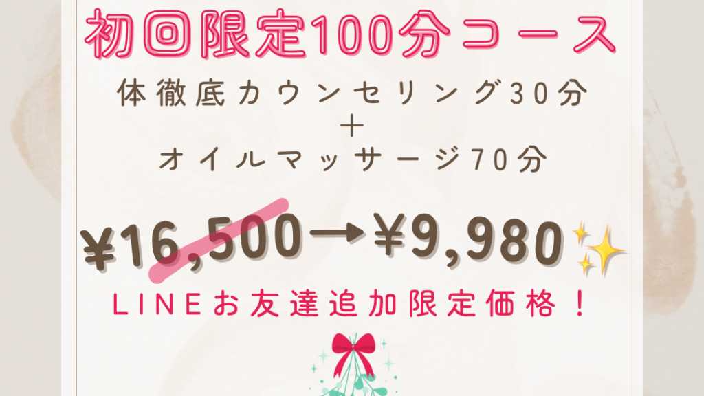 🌟🌟🌟この価格はこちらからのご予約・初回限定価格です🌟🌟🌟 マッサージセラピーってどんなもの?深感覚のオイルマッサージ セラピーをまず体験してみたい方におすすめ🍀施術70分+身体分析徹底カウンセリング30分のたっぷり100分お試しコース🍀通常16,500円のところ12,500円にてお試しいただけます✨✨✨ さらに❗️ご新規様でLINEお友達追加をしていただいた方には、感謝の気持ちを込めまして初回限定コース通常16,500円のところを9,980円とさせていただきます💖 ※ご予約の際、公式LINE画面に「初回100」とメッセージをご入力いただくか、ご来店時にお友達追加していただいた方に限らせていただきます ✨✨✨想像を超える感動体験✨✨✨ 初回はマッサージセラピーの醍醐味であるホットストーンよりも温まる心地よい深い圧で、体の芯からじわ〜っとほぐれる深感覚をご体感ください。 🌟🌟🌟この価格はこちらからのご予約・初回限定価格です🌟🌟🌟 🕊今、一番つらいところをじっくり緩めていきます🕊 施術後のお体の状態で効果を感じていただけましたら、その状態をキープできるようあなたに最適なメンテナンススパンやホームケアのアドバイスをさせていただきます。 ご一緒に目指すお体の状態を作っていきましょう😊✨ ※こちらのコースは特にお疲れの部分を中心に行いますので、上半身のみ、下半身のみなどお辛い箇所を絞ってほぐしていきます。全身をご希望でしたら、施術90分以上のコースをお勧めいたします。 ※こちらのコースのお支払いは現金またはPayPayのみとさせていただいております ※フットバスはリフレクソロジー組み合わせのコースのみにおつけしております。フットバスのみご希望の場合は600円にて承りますのでお気軽にお申し付けください。(ご予約の際に備考欄に「フットバス」とご記入いただけますと幸いです) ※フットバスの時間は施術時間に含みません ※他割引との併用不可 コース時間以外に+30〜50分程お時間をいただきます。 最終受付時間は19:00(土日祝は18:00)となります。 ※価格は税込です