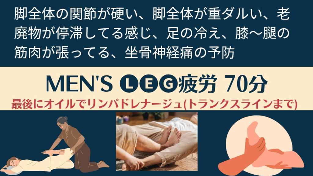 ■内容 男性🚹 の下半身コースです。足~臀部を含む脚全体の疲労感、浮腫み感、足首や股関節の硬さで、腰から足が疲れてる方に向いてます。 マイルドで深いストレッチは、癒し効果も得つつ 坐骨神経痛の予防や 関節の和らげもなります。 ■施術の流れ セラピストの足や膝、手による、ほぐしやストレッチで 筋肉や関節を緩めたあと→→オイルでリンパドレナージュ(血液やリンパを循環元に流す)をします✨ 蒸しタオルで拭き取りますので、ペタペタ感が残ることはありません。 ※※ オイルリンパドレナージュは トランクスラインまでです※※※ ■予約の際の注意事項📣 承認、確定通知は、登録したメール✉に届きます。 通知メールに返信はできないので、 質問や 変更、キャンセルは、「LINE」へお願いします🙇♀️ ■キャンセルポリシー🪴 ①早期予約特典の方は「予約日の2日前まで」に 変更やキャンセルをお願いします。 (2日前迄の変更なら、そのまま特割は適応♪♪) ②通常予約の方は、「前日の12時まで」 に キャンセルお願いします。 🌿当日の急なキャンセルは、キャンセル料が発生します。その際は、PayPayや銀行振込にてお支払いお願いします。(プリペイドや事前決済の場合はキャンセル料に充当) 体調不良や予期せぬ事、みんなあると思います。 私も 緊急事態はあります💦お互い様なのは重々承知なのですが、ドタキャンや無断キャンセルは その時間に、他のお客様が入れなかった損失が生まれてしまう為、ルールを設けさせていただきました🙇♂️🙇♀️ また、サロン側から急なキャンセルがあった場合は、お詫びをさせていただきます。