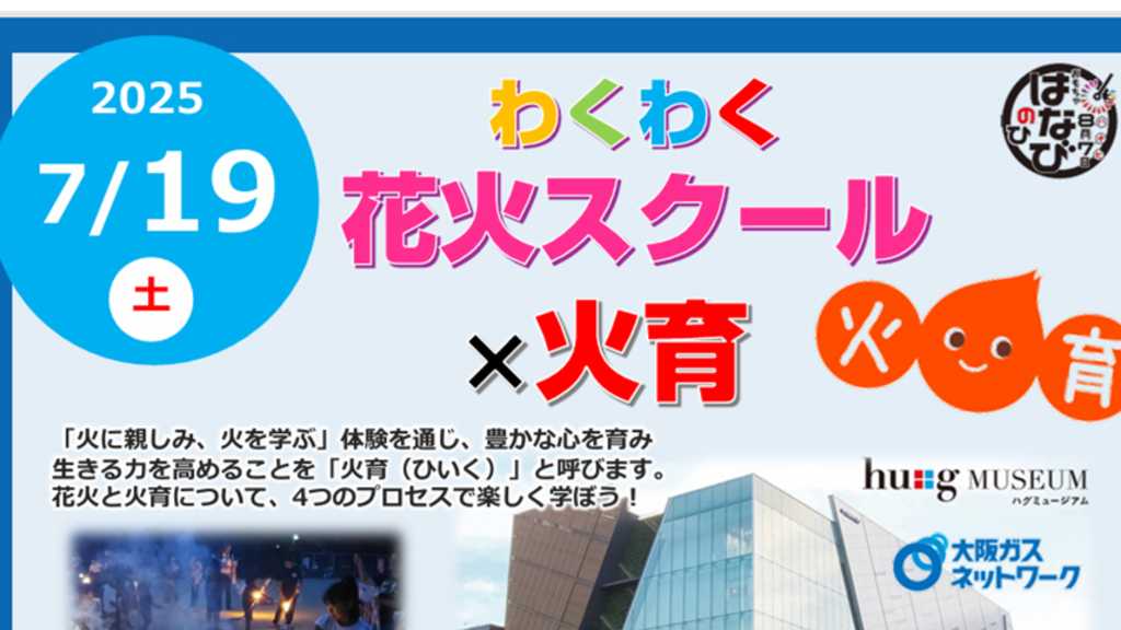■サービスの内容 日本煙火協会が主催する「わくわく花火スクール」が今回だけの特別プログラムを開催します。大阪ガスネットワークが提唱する「火育」プログラムとのコラボ開催となります。 プロから火と花火について学び、火を起こし、その火を正しく使用して行う手持ち花火。以上を体験していただきます。 ■当日の流れ 各回開始15分前からハグミュージアム3階会議室に集合・受付 火育と花火を学びます(座学) 1階野外スペースに移動して古代の火おこし体験 手持ち花火体験 3階会議室に移動しアンケートに答えていただき終了となります。 ■予約の際の注意事項 大人の方のサポートが必要なため、必ず親子でご参加ください。 1人の小学生のお子様に対し、保護者様2名まで参加可能です。 1組は最大3名となります。(例:小学生1人、親2人。体験する小学生1人、見学する未就学児1人、親1人。体験する小学生1人、見学する小学生1人、親1人) お支払いは事前決済のみとなります。 ※プロの指導の下でイベントを行いますが、火を扱いますので、やけどなどの可能性がゼロではございません。もし何かあった際は自己責任になることをご了承いただき、ご予約をお願いいたします。 ■キャンセルに関して 台風などの悪天候の場合は開催不可となります。 その場合は7月18日17時頃にご予約いただいたメールアドレスにご案内させていただきます。