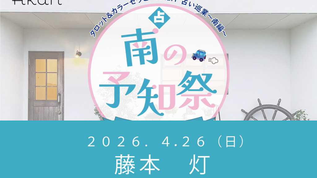 -*--*-*-*-*--ご予約時のお願い*-*-*-*-*-*- 備考欄に 30分鑑定の場合は1 60分鑑定の場合は2 90分鑑定の場合は3 と記載お願いいたします。 -*--*-*-*-*--*-*-*-*-*-*--*--*-*-*-*- 占いに興味はあるけれど・・・少し遠い!! 日頃の感謝を込めて、熟練鑑定師が皆様に会いに参ります! タロット&カラーセラピーAkari 占い巡業~南編~ 『南の予知祭』 2026年4月26(日) 11:00~18:00 LaVoile(ラヴォワール)様 〒774-0005 徳島県阿南市向原町天羽畭115−1 出演鑑定師はいくつもの占術(西洋占星術・数秘術・手相・タロット・ルノルマン・ルーン・インナーチャイルド・カラーセラピー)を扱える経験豊富な鑑定師ばかりです。 あなたの悩みや知りたいことをお伝えくだされば、必要な占術を用いて 鑑定させていただきます。 おみくじ付きの開運カヌレのプレゼント付き♪ この機会に是非、占いを体験してみてください。 料金(税込) 30分 3500円 開運カヌレ1個 60分 6000円(おすすめのコース) 開運カヌレ2個 90分 8000円(じっくり鑑定希望の方) 開運カヌレ3個 ※ご予約優先です。 ※ご予約時間を10分すぎるとキャンセル扱いとなります。お時間にゆとりを持ってお越しください。 -*--*-*-*-*藤本 灯先生のメッセージ-*-*-*-*-*-*- 年間鑑定人数約1000件。 様々なお悩みに真摯に向き合ってまいりました。 占いを深く学び、そして占いの結果をまっすぐに受け取って ご相談者様に寄り添いながら、必要な占術を用いて、的確に鑑定させていただきます。 今回、初の阿南でのイベントです。 この出会いを大切に、あなたにとって、より良い人生の選択ができるように一生懸命サポートさせていただきます! -*--*-*-*-*--ご予約時のお願い*-*-*-*-*-*- 備考欄に 30分鑑定の場合は1 60分鑑定の場合は2 90分鑑定の場合は3 と記載お願いいたします。